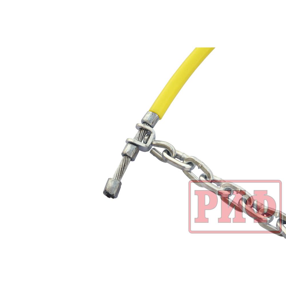 Конструкция из гибкого троса с замком по внутреннему диаметру с перекрещивающимися диагональными линиями цепей и цепью натяжного механизма с натяжителем по внешнему диаметру колеса.